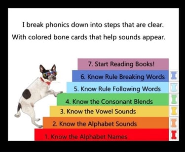Start with color-coded bone fans that break phonics' names and sounds into 6 levels of colored "bones."
